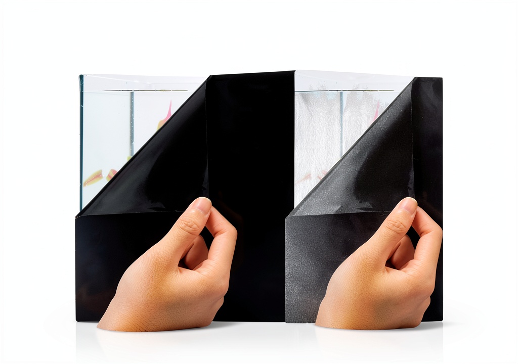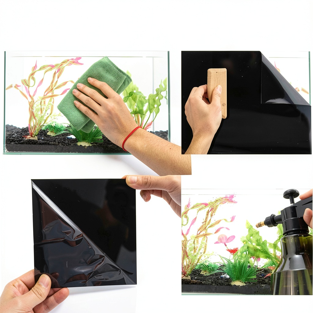 Spray the background and tank glass with water to reduce stickiness, then smoothly apply from one edge, using a squeegee to push out air bubbles for a seamless finish.